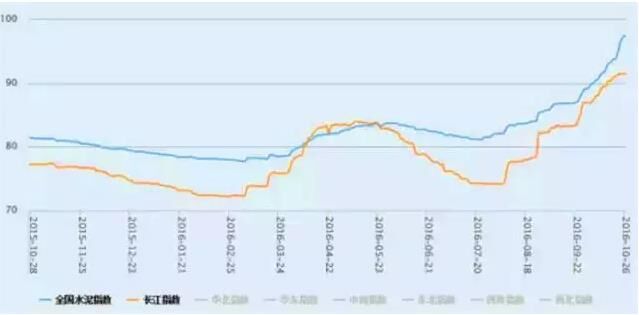 最近一年全國水泥價格指數(shù)(藍色線)和長江指數(shù)(紅色線)走勢
