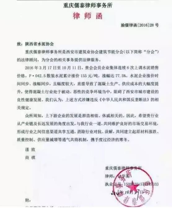 10月27日,鑒于陜西省內水泥市場及混凝土市場發(fā)展情況,西安市建筑業(yè)協(xié)會建筑節(jié)能分會認為這一市場情況違法了《中華人民共和國反壟斷法》的相關規(guī)定,并向陜西省水泥協(xié)會發(fā)律師函。希望水泥行業(yè)從產(chǎn)業(yè)鏈及長遠發(fā)展的角度出發(fā),與混凝土行業(yè)一道,共同維護良好的市場交易環(huán)境,形成行業(yè)之間信息渠道共享互通,消除行業(yè)對抗、誤解,共同建立起原材料漲跌,質量控制、供應量減增等通氣共商機制,攜手度過經(jīng)濟寒冬。