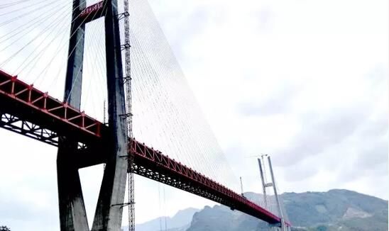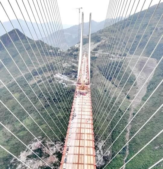 “鋼絞線拉索施工的化整為零施工方法,可以單根鋼絞線運(yùn)輸,一兩噸的小貨車也可以拉運(yùn),到現(xiàn)場再組裝、掛索,吊裝可以用小型的設(shè)備,施工張拉可以采用重量很輕的小型張拉設(shè)備?!崩钗墨I(xiàn)說,這就很好地解決了運(yùn)輸、起吊方面的難題,施工也比平行鋼絲拉索便利很多,非常契合世界第一高橋的施工工況。