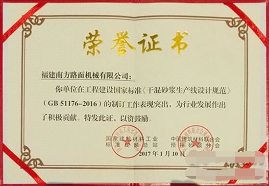 2017年1月10日,在2017'首屆中國國際預(yù)拌砂漿裝備技術(shù)研討會(huì)暨預(yù)拌砂漿綠色生產(chǎn)裝備及機(jī)械化施工技術(shù)峰會(huì)上,福建南方路面機(jī)械有限公司被中國建材聯(lián)合會(huì)預(yù)拌砂漿分會(huì)授予“中國預(yù)拌砂漿行業(yè)裝備制造培訓(xùn)基地”;同時(shí),因在國家標(biāo)準(zhǔn)GB51176-2016《干混砂漿生產(chǎn)線設(shè)計(jì)規(guī)范》編制工作中的特殊貢獻(xiàn),被授予“特別貢獻(xiàn)單位”。