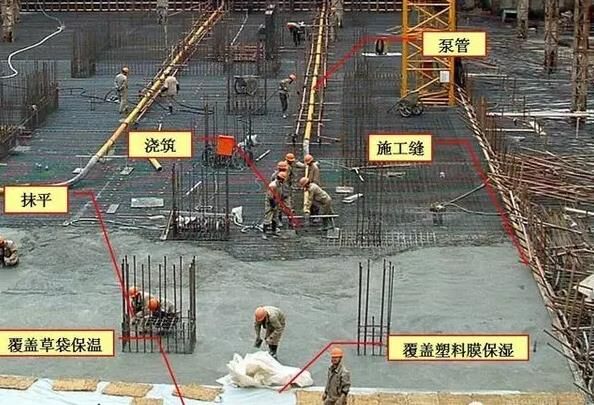 6、大體積泵送混凝土經(jīng)振搗后表面水泥漿較厚,容易引起表面裂縫。首先,要求在振搗最上一層混凝土?xí)r,控制振搗時(shí)間,注意避免表層產(chǎn)生太厚的浮漿層;在澆搗后,必須及時(shí)用2m 長括尺,將多余浮漿層刮除,按照標(biāo)高控制點(diǎn),將混凝土表面括拍平整。有凹坑的部位必須用混凝土填平,在混凝土收漿接近初凝時(shí),混凝土面進(jìn)行二次抹光,用木蟹全面仔細(xì)打抹兩遍,既要確?;炷恋钠秸?,又要把其初期表面的收縮脫水細(xì)縫閉合,在混凝土收漿凝固施工期間,除了具體施工人員外,不得在未干硬的混凝土面上隨意行走,收漿工作完成的面必須同步及時(shí)覆蓋薄膜。