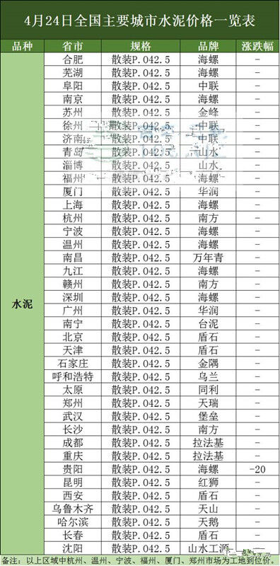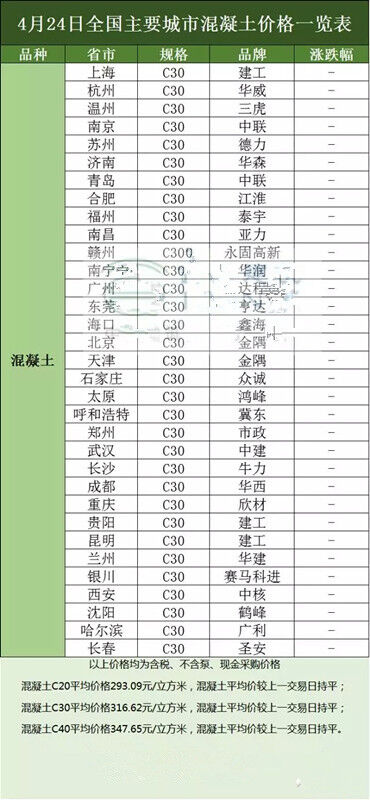 砼商網(wǎng)資源分享,4月24日全國主要城市水泥、混凝土、價格表。