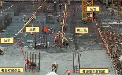 6、大體積泵送混凝土經(jīng)振搗后表面水泥漿較厚,容易引起表面裂縫。首先,要求在振搗最上一層混凝土?xí)r,控制振搗時(shí)間,注意避免表層產(chǎn)生太厚的浮漿層;在澆搗后,必須及時(shí)用2m 長(zhǎng)括尺,將多余浮漿層刮除,按照標(biāo)高控制點(diǎn),將混凝土表面括拍平整。有凹坑的部位必須用混凝土填平,在混凝土收漿接近初凝時(shí),混凝土面進(jìn)行二次抹光,用木蟹全面仔細(xì)打抹兩遍,既要確保混凝土的平整度,又要把其初期表面的收縮脫水細(xì)縫閉合,在混凝土收漿凝固施工期間,除了具體施工人員外,不得在未干硬的混凝土面上隨意行走,收漿工作完成的面必須同步及時(shí)覆蓋薄膜。