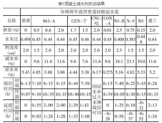 分別準確稱取水泥300g、減水劑300g及水300g,按規(guī)范方法,將水、減水劑及水泥凈漿進行拌和。在干凈的玻璃上將拌和好的水泥講講裝入試模中,將試模逐次提起后,對水泥凈漿的流動情況進行觀察,并對水泥凈漿的流動性能進行測試,看其能否滿足混凝土泵送要求。同時,對不同的水泥、不同的減水及減水率大小及摻量進行記錄,然后優(yōu)選,如表1所示。