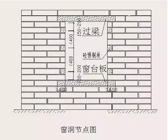 當(dāng)外墻為砌體時,須在外門窗洞兩側(cè)預(yù)埋C20混凝土塊(有混凝土企口情況除外),以便固定窗框(或副框)?;炷翂K寬度同墻厚,高度應(yīng)與砌塊同高或砌塊高度的1/2且不小于100mm,長度不小于200mm,最上部(或最下部)的混凝土塊中心距洞口上下邊的距離為150~200mm,其余部位的中心距不大于400mm,且均勻分布。嚴禁采用預(yù)埋木磚固定門窗。