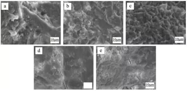 圖 1 不同膨脹劑摻量的預(yù)拌補償收縮混凝土微觀形貌(1000×) (a)HCSA:0%; (b)HCSA:4%; (c)HCSA:6%; (d)HCSA:8%; (e)HCSA:10%