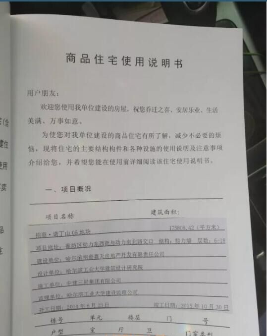在哈爾濱市城鄉(xiāng)建設委員會官方網(wǎng)站上,記者查到了“招商諾丁山 05 地塊 8#樓”的《哈爾濱市工程竣工驗收備案證》,備案號為黑建備字號2015380,建設單位為哈爾濱招商嘉天房地產(chǎn)開發(fā)有限責任公司,施工單位為中建三局集團有限公司,監(jiān)理單位為哈爾濱工業(yè)大學建設項目管理公司,開竣工日期為2014年6月15日-2015年12月18日,備案日期2015年12月18日。