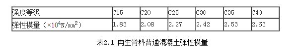 2)僅摻用Ⅰ類(lèi)再生粗骨料配制的混凝土,其受壓和受拉彈性模量可按現(xiàn)行國(guó)家標(biāo)準(zhǔn)《混凝土結(jié)構(gòu)設(shè)計(jì)規(guī)范》GB 50010的規(guī)定取值;其他類(lèi)別再生骨料配制的再生骨料混凝土,其彈性模量宜通過(guò)試驗(yàn)確定,在缺乏試驗(yàn)條件或技術(shù)資料時(shí),可按表2.1的規(guī)定取值。