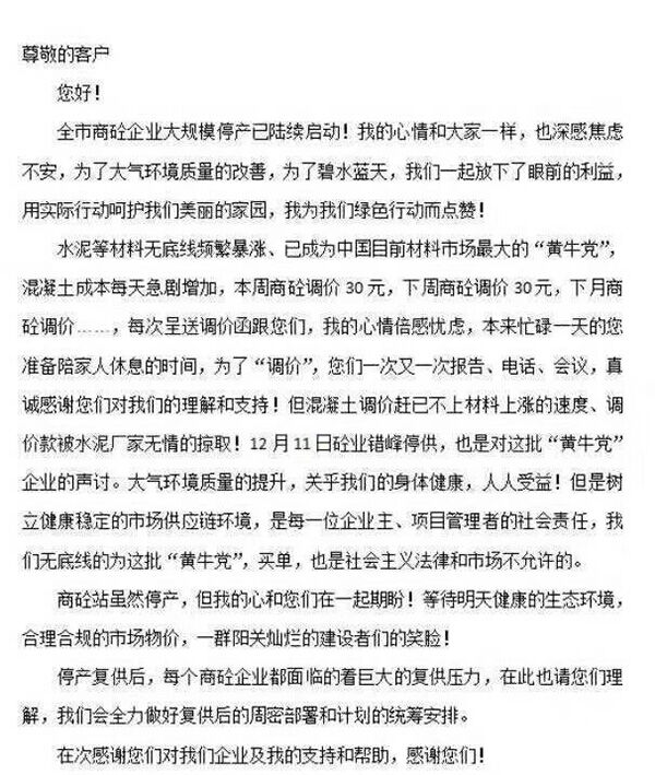 決議除了請求政府干預(yù)價(jià)格之外,還要求會員單位堅(jiān)決抵制因價(jià)格波動采取惡意低價(jià)競爭搶占市場的行為;要求會員單位與施工單位及時(shí)溝通,在雙方因價(jià)格調(diào)整未達(dá)成一致且合同未終止前,其他企業(yè)一律不得低價(jià)介入;要求各片區(qū)響應(yīng)政府環(huán)保要求,及時(shí)采取錯峰生產(chǎn)、停產(chǎn)限產(chǎn)等措施。