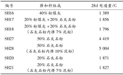 研究發(fā)現(xiàn)摻加石灰石粉對混凝土的抗氯離子滲透性有一定的不利影響,但摻量為20%時(shí)影響不大,一定的含泥量也不影響電通量的測試結(jié)果。當(dāng)摻量達(dá)到50%時(shí),混凝土抗氯離子滲透性能顯著降低,且10%的含泥量對測試結(jié)果也產(chǎn)生一定影響。