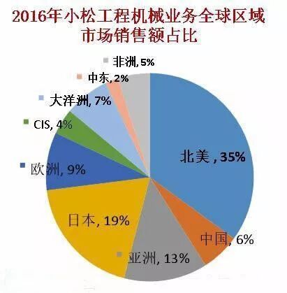 盡管每年有大筆收入來自中國,但小松工程機(jī)械業(yè)務(wù)最大的市場其實是北美,銷售額占比35%;中國銷售占比只有6%,還不如日本本土——19%。