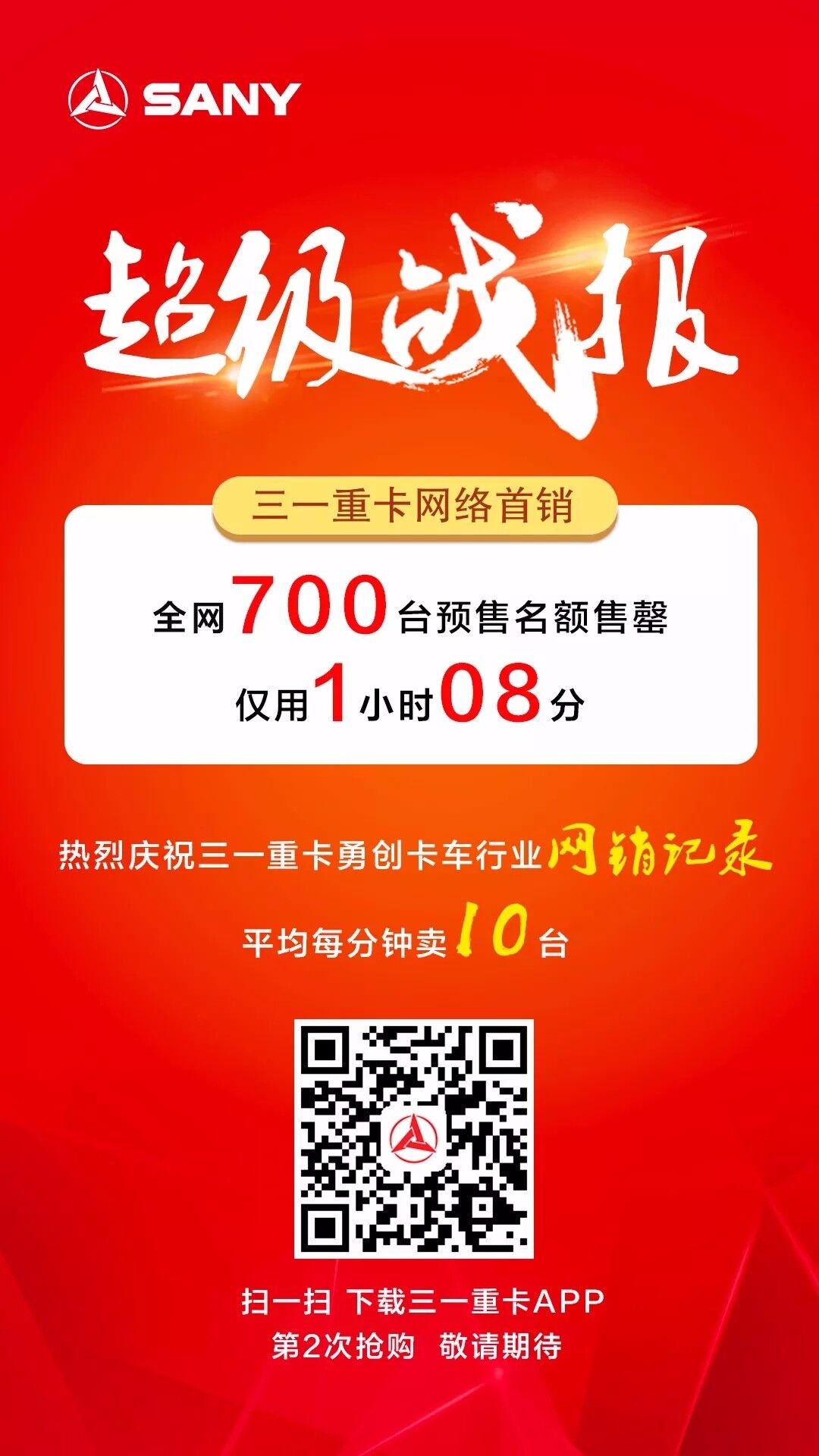 導(dǎo)語:2018年3月31日,三一重卡首批700臺預(yù)售名額在網(wǎng)絡(luò)上鳴鑼開賣,僅用1小時8分鐘,700臺預(yù)售名額搶購一空,不僅開創(chuàng)了重卡廠家網(wǎng)絡(luò)直銷的先河,更是創(chuàng)造了重卡互聯(lián)網(wǎng)銷售臺數(shù)和總金額的雙重紀錄!