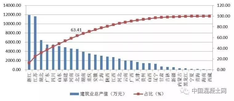 除浙江、江蘇兩省外,總產值超過4000億元的還有湖北、廣東、四川、山東、福建、河南和北京共7個地區(qū),上述9省市完成的建筑業(yè)總產值占全國建筑業(yè)總產值的63.41%(圖1)。
