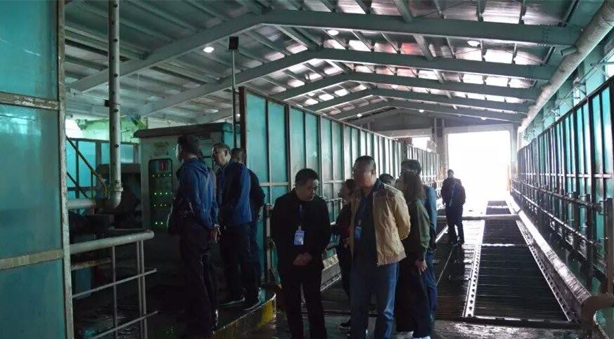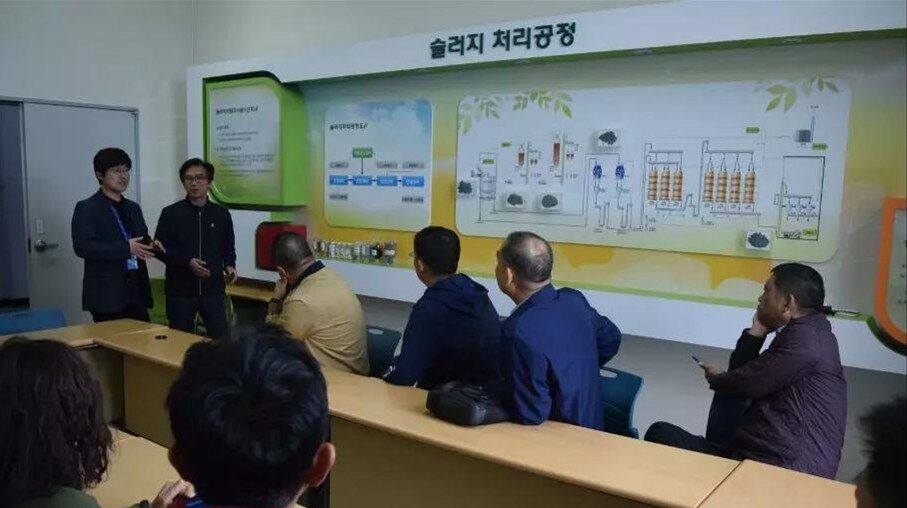 10日下午考察團(tuán)一行到達(dá)韓國(guó)最大的垃圾填埋廠,首先參觀生活食品垃圾運(yùn)輸車(chē)輛沖洗設(shè)備,此套設(shè)備由兩組車(chē)輛沖洗線(xiàn)構(gòu)成,每條線(xiàn)長(zhǎng)度為50米,當(dāng)車(chē)輛駛?cè)胫粮袘?yīng)區(qū)設(shè)備自動(dòng)啟動(dòng)對(duì)車(chē)輛全方位立體式?jīng)_洗,沖洗中掉落的異物經(jīng)特制排泥裝置送至中央皮帶輸送機(jī)。車(chē)輛完成沖洗后駛出前對(duì)車(chē)身噴淋消毒去異味藥劑,最后烘干后離開(kāi)。每日完成一千車(chē)次的清洗消毒工作。
