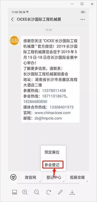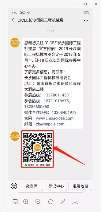 第1步,掃碼關(guān)注“CICEE長沙國際工程機(jī)械展”微信公眾號,點(diǎn)擊“參會登記”,獲取小程序二維碼。