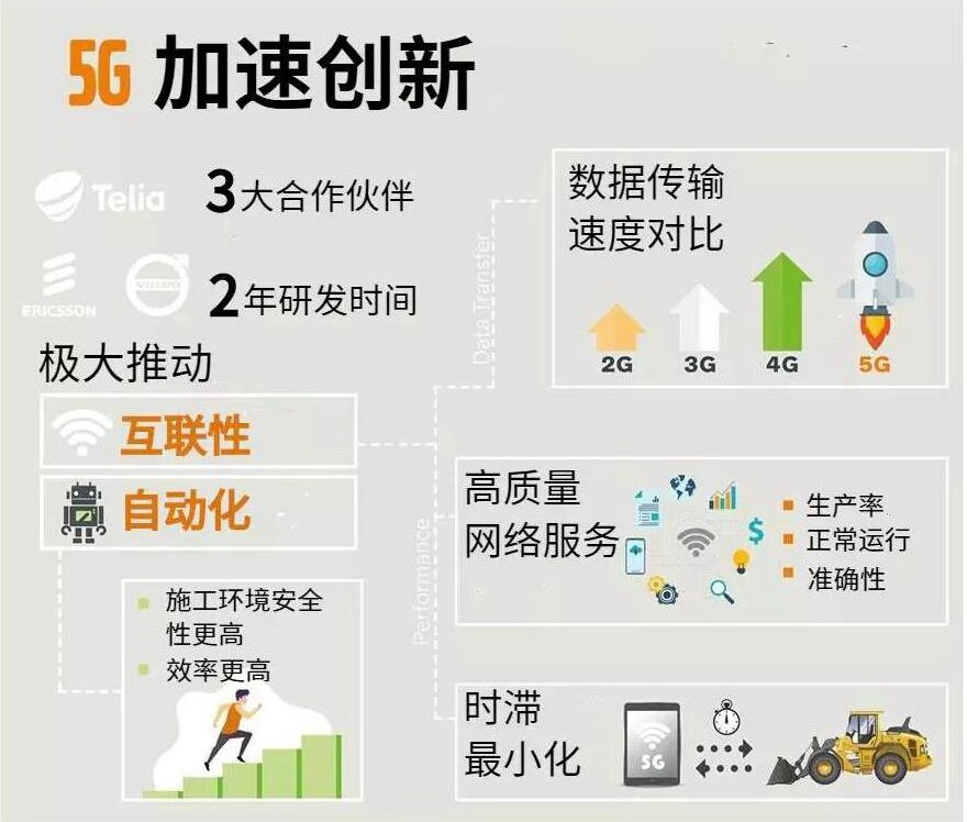 2019年3月,沃爾沃建筑設(shè)備攜手瑞典電信運(yùn)營商特利亞(Telia)和愛立信啟動(dòng)了瑞典首個(gè)工業(yè)5G網(wǎng)絡(luò),將用于遠(yuǎn)程控制輪式裝載機(jī)測試。憑借極短的響應(yīng)時(shí)間、大容量、高度的移動(dòng)網(wǎng)絡(luò)可接入性,5G技術(shù)能為提高效率、降低成本和降低環(huán)境風(fēng)險(xiǎn)。