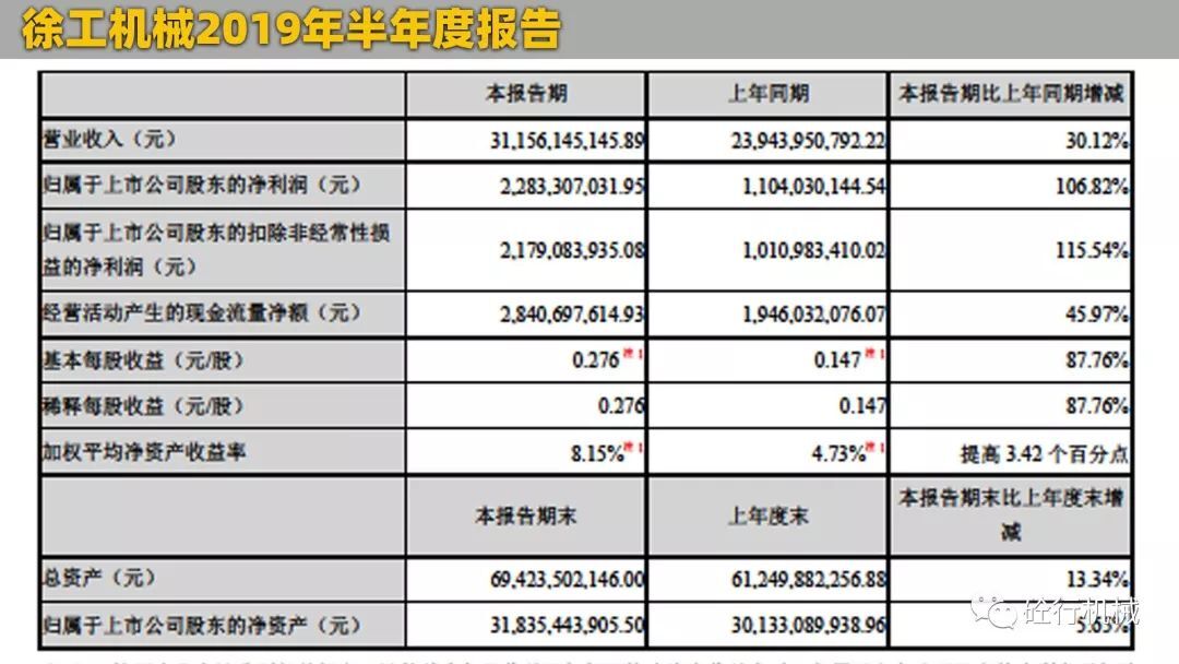 2019年上半年,徐工機(jī)械實(shí)現(xiàn)營業(yè)總收入311.56億元,同比增長30.12%。其中包括海外收入44.48億元,同比增長20.07%;歸屬于上市公司股東的凈利潤22.83億元,同比增長106.82%。相比較2018年上半年,今年上半年徐工的成績還是很喜人的,特別是在凈利潤這一塊,比去年同期增加了一倍之多。