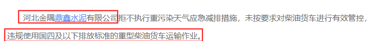 此外,今年10月河北金隅鼎鑫水泥有限公司拒不執(zhí)行重污染天氣應(yīng)急減排措施,未按要求對柴油貨車進(jìn)行有效管控,違規(guī)使用國四及以下排放標(biāo)準(zhǔn)的重型柴油貨車運(yùn)輸作業(yè),被當(dāng)?shù)丨h(huán)保部門通報。