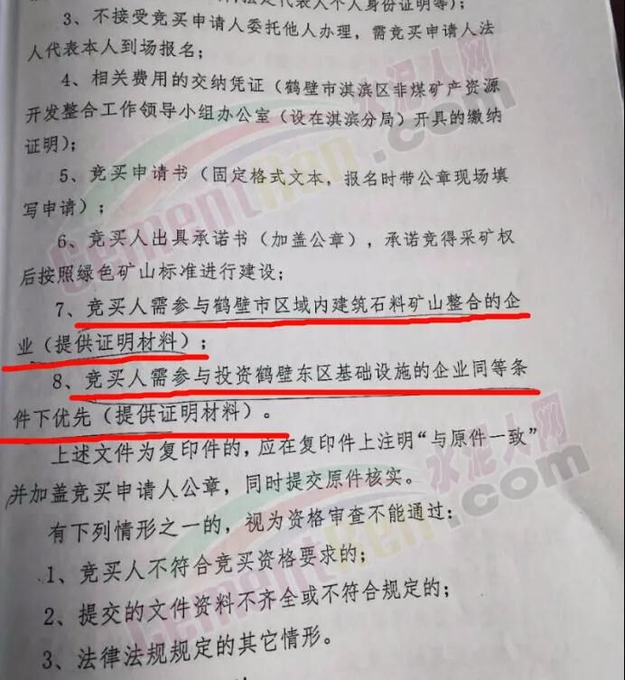 但是,該企業(yè)在參與競(jìng)標(biāo)時(shí)確被駁回,理由是竟買人需參與鶴壁市區(qū)域內(nèi)建筑石料礦山整合的企業(yè)(提供證明材料);同時(shí)要滿足競(jìng)買人需參與投資鶴壁東區(qū)基礎(chǔ)設(shè)備的企業(yè)同等條件優(yōu)先(提供證明材料)。不屬于鶴壁市的企業(yè)或者沒有參于鶴壁市區(qū)域礦山整合的企業(yè)是不能參與競(jìng)標(biāo),這與公告中的強(qiáng)調(diào)的價(jià)高者得完全不符。