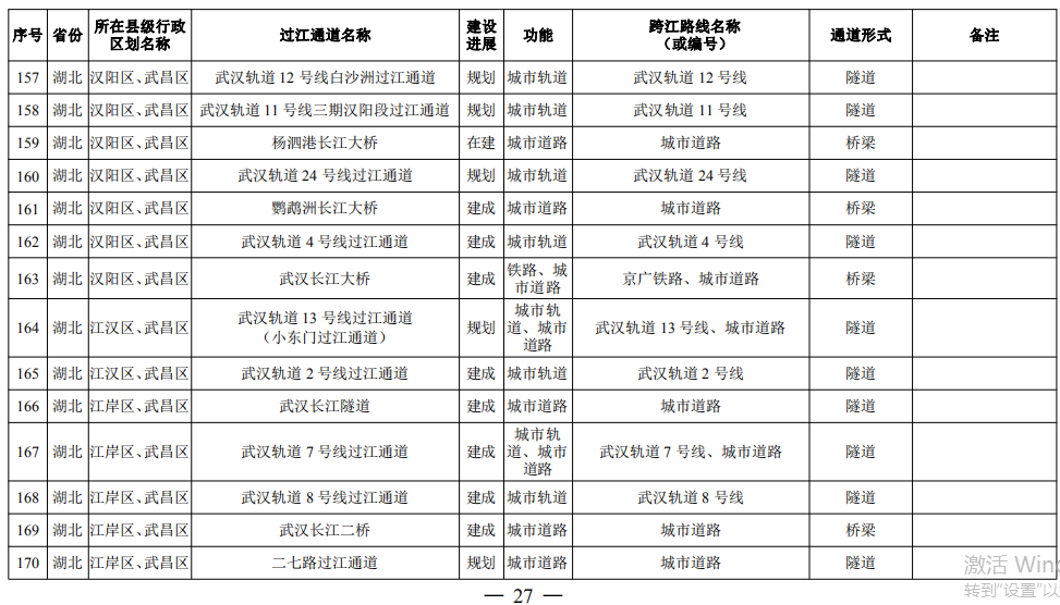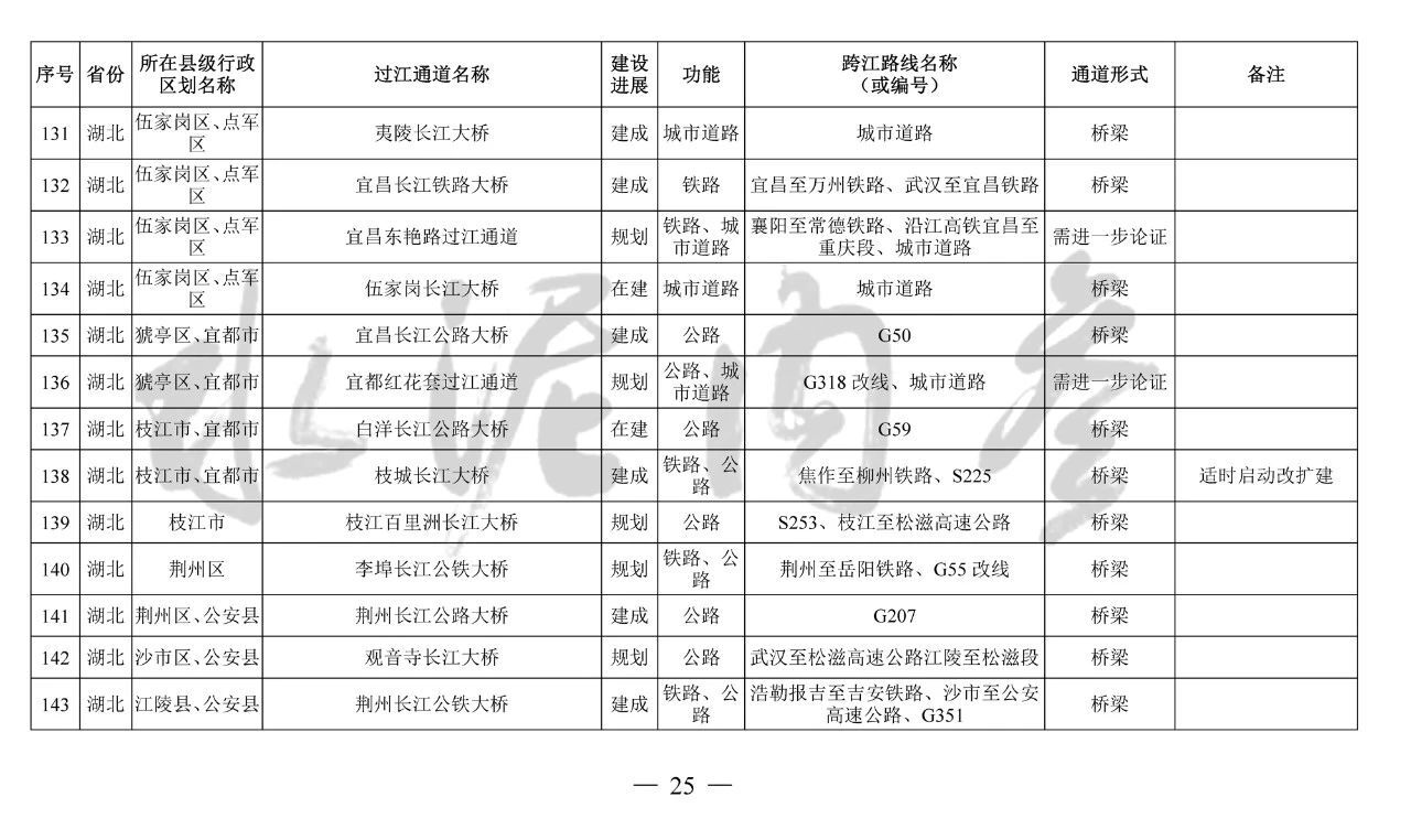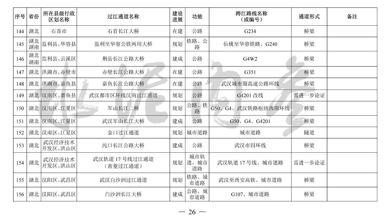 湖北省(24座):巴東長(zhǎng)江公路二橋、興山至長(zhǎng)陽(yáng)高速公路過(guò)江通道、宜昌東艷路過(guò)江通道、宜都紅花套過(guò)江通道、枝江百里洲長(zhǎng)江大橋、李埠長(zhǎng)江公鐵大橋、觀音寺長(zhǎng)江大橋、武漢都市區(qū)環(huán)線漢南過(guò)江通道、軍山長(zhǎng)江二橋、武漢軌道17號(hào)線過(guò)江通道(青菱過(guò)江通道)、武漢白沙洲過(guò)江通道、武漢軌道12號(hào)線白沙洲過(guò)江通道、武漢軌道11號(hào)線三期漢陽(yáng)段過(guò)江通道、武漢軌道13號(hào)線過(guò)江通道(小東門過(guò)江通道)、二七路過(guò)江通道、武漢軌道10號(hào)線二七過(guò)江通道、武漢軌道12號(hào)線丹水池過(guò)江通道、堤角過(guò)江通道、武漢軌道20號(hào)線過(guò)江通道、武漢軌道25號(hào)線過(guò)江通道(長(zhǎng)江新城過(guò)江通道)、武漢軌道新港線陽(yáng)邏過(guò)江通道、光谷過(guò)江通道、新港高速雙柳長(zhǎng)江大橋、鄂黃第二過(guò)江通道鄂湘界(1座):監(jiān)利至華容公鐵兩用大橋