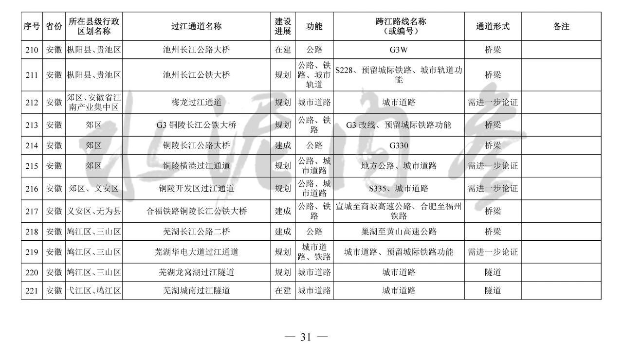 安徽省(9座):望江長(zhǎng)江公鐵大橋、安慶??陂L(zhǎng)江公路大橋、池州長(zhǎng)江公鐵大橋、G3銅陵長(zhǎng)江公鐵大橋、銅陵開(kāi)發(fā)區(qū)過(guò)江通道、蕪湖北京路過(guò)江隧道、蕪湖泰山路長(zhǎng)江公鐵大橋、馬鞍山長(zhǎng)江公鐵大橋、馬鞍山九華路過(guò)江通道
