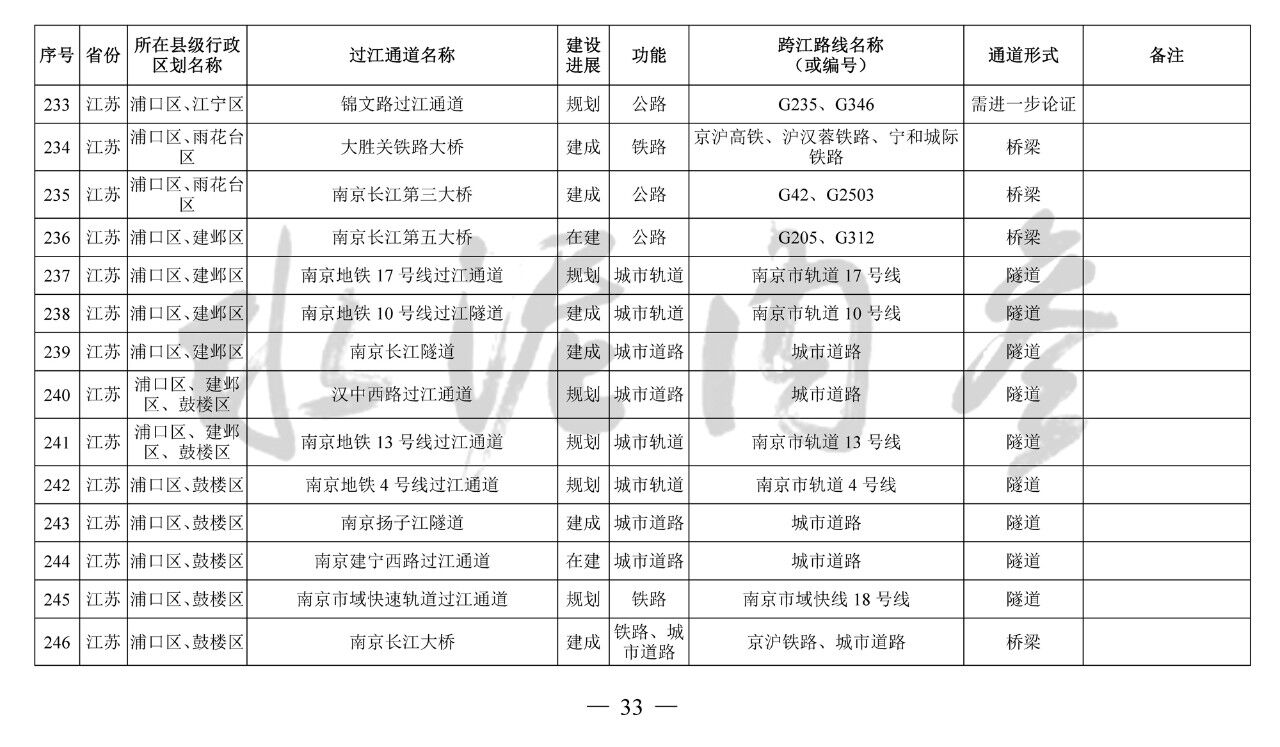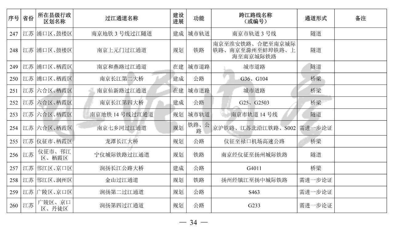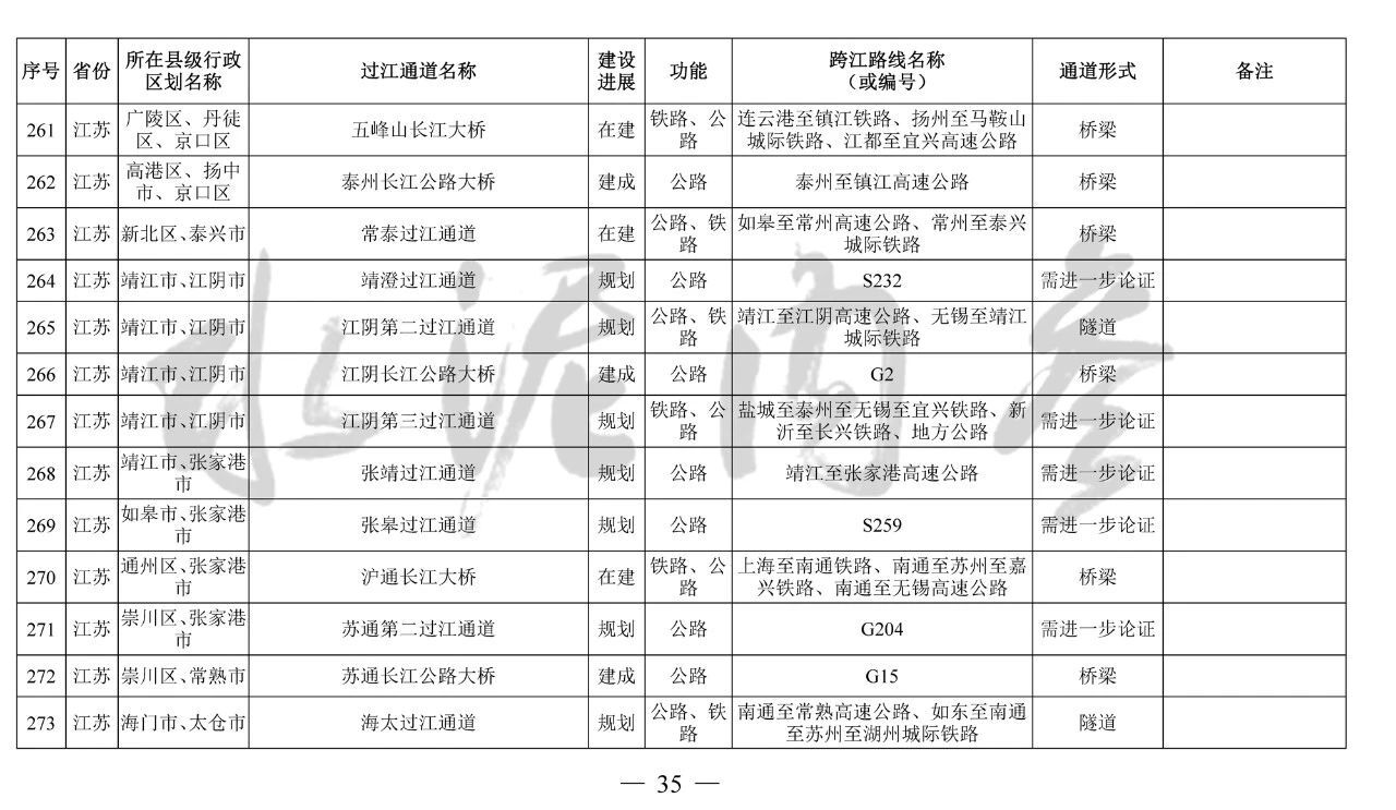 江蘇?。?3座):錦文路過(guò)江通道、南京地鐵4號(hào)線過(guò)江通道、南京市域快速軌道過(guò)江通道、南京上元門過(guò)江通道、南京七鄉(xiāng)河過(guò)江通道、龍?zhí)堕L(zhǎng)江大橋、寧儀城際鐵路過(guò)江通道、潤(rùn)揚(yáng)第二過(guò)江通道、江陰第二過(guò)江通道、江陰第三過(guò)江通道、張皋過(guò)江通道、蘇通第二過(guò)江通道、海太過(guò)江通道