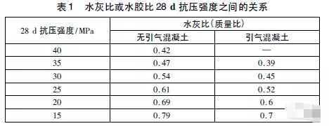 當(dāng)無試驗(yàn)資料可用時(shí),對于含有Type1波特蘭水泥(硅酸鹽水泥)的混凝土,可以在表1中得到近似和相對固定的數(shù)據(jù)。用有代表性的材料,在試驗(yàn)室標(biāo)準(zhǔn)養(yǎng)護(hù)條件下試驗(yàn)28d的試塊,表1中的水膠比可以得到與之對應(yīng)的強(qiáng)度。