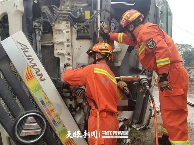 到達現(xiàn)場后,指揮員立即下車對現(xiàn)場情況進行偵查,發(fā)現(xiàn)事故車輛是一臺裝滿了35噸混凝土的罐車,由于雨天路滑,司機行駛到一段下坡路時因操作不當(dāng)發(fā)生側(cè)翻。駕駛員被困在駕駛室內(nèi),駕駛室已嚴(yán)重變形,無法將車門正常開啟,現(xiàn)場醫(yī)護人員正為司機輸液補充能量。