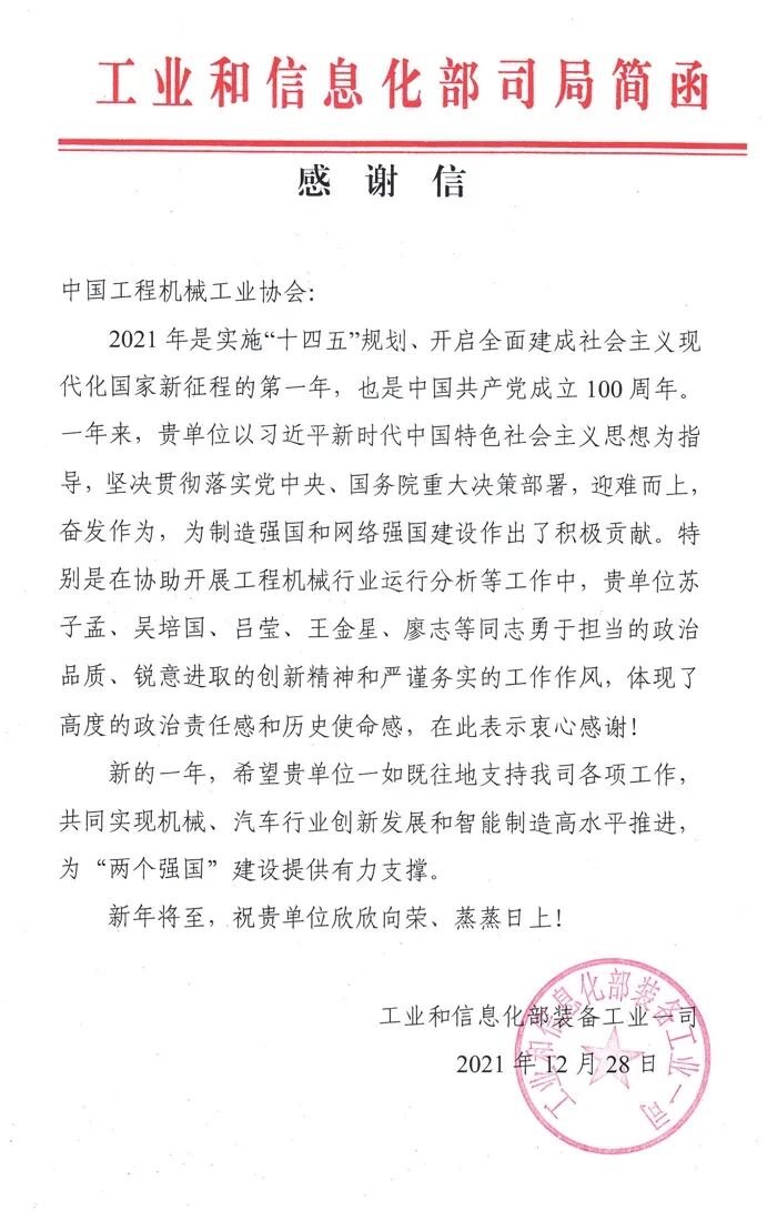近日,工業(yè)和信息化部裝備工業(yè)一司致函中國(guó)工程機(jī)械工業(yè)協(xié)會(huì),對(duì)協(xié)會(huì)一年來,堅(jiān)持以習(xí)近平新時(shí)代中國(guó)特色社會(huì)主義思想為指導(dǎo),堅(jiān)決貫徹落實(shí)黨中央、國(guó)務(wù)院重大決策部署,迎難而上,奮發(fā)作為,在制造強(qiáng)國(guó)和網(wǎng)絡(luò)強(qiáng)國(guó)建設(shè)工作,特別是積極配合協(xié)助開展工程機(jī)械行業(yè)運(yùn)行分析等工作表示感謝!