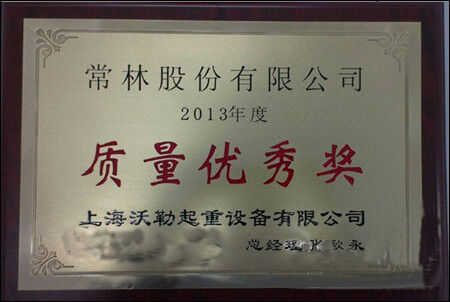 因常林股份公司在交貨期、產(chǎn)品質(zhì)量等方面的優(yōu)秀表現(xiàn),在知名的裝卸設(shè)備制造商上海沃勒起重設(shè)備有限公司2013年度供應(yīng)商會議上,被評為優(yōu)秀供應(yīng)商,榮獲質(zhì)量優(yōu)秀獎。
