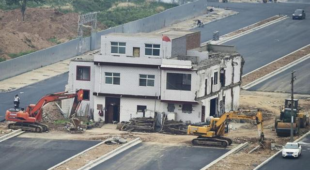5月16日,在河南洛陽(yáng)洛龍區(qū)龍門(mén)大道旁一條即將開(kāi)通行車的道路中央,一棟3層的住宅正位于道路的兩個(gè)快車道正中央,正好攔腰截?cái)嗔寺返臇|西走向,該住宅旁邊的鄰居拆遷后只剩余部分房屋和窗戶等,該屋頂懸掛一面國(guó)旗,屋前兩輛挖掘機(jī)嚴(yán)正以待,等待拆挖。
