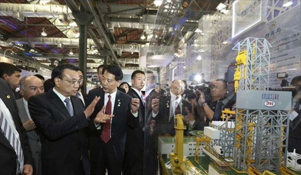 當(dāng)?shù)貢r間20日,李克強在里約熱內(nèi)盧州州長佩藏和巴西外長維埃拉的陪同下來到里約民港碼頭,參觀正在這里舉辦的中國裝備制造業(yè)展覽,并為展覽開幕剪彩。展覽包括鐵路及軌道交通、電力、通信、金融等10個板塊,代表國內(nèi)裝備制造業(yè)最高水平的30家中國企業(yè)參展。
