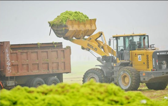 卡車等重型設備被派上了用場。在青島月亮灣沙灘,當天隨海浪侵入沙灘的大量滸苔被裝載機推成大堆,然后運送到挖掘機事先挖掘好的大坑中,用土掩埋。據(jù)了解,掩埋的滸苔腐爛后,還可以變成生物肥料,改變海岸邊土質(zhì),利于綠化和植樹造林。