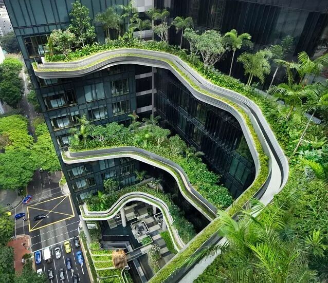 建筑流動(dòng)的幾何體給人一種高聳入云之感,塔樓每隔三層客房擁有懸挑的空中花園,上面種滿(mǎn)了熱帶植物,它已成為城市綠地的一部分,與鄰近公園融為一體。酒店擁有自我遮陽(yáng)功能,懸挑而出的空中花園和相鄰的三座酒店客房大樓都能起到遮陽(yáng)的作用,客房樓層立面采用低輻射玻璃。酒店頂樓的屋頂花園可將全城風(fēng)光一覽無(wú)余,獨(dú)家蘭花貴賓會(huì)所位處該層,并配有私人會(huì)議空間、圖書(shū)館和專(zhuān)用的貴賓會(huì)所門(mén)房。酒店五層設(shè)有可俯瞰城市的無(wú)邊界泳池,設(shè)備先進(jìn)的健身中心,特色的鳥(niǎo)籠休息涼亭及長(zhǎng)達(dá)300米花園走道。