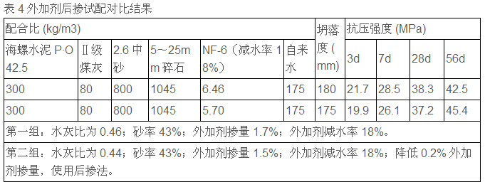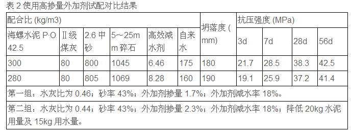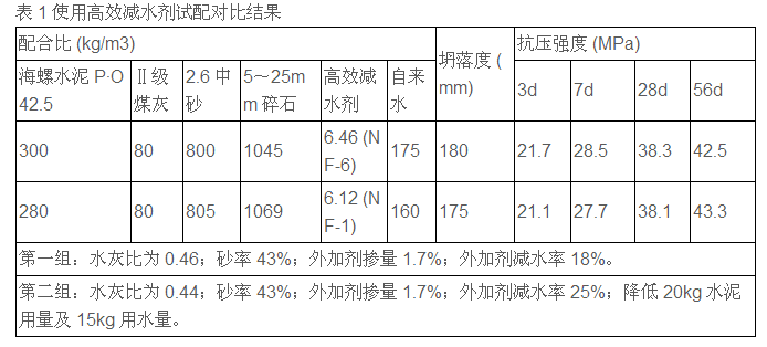 試配對比結(jié)果分析:其他材料相同,使用高效減水劑(NF-1),保持砂率及外加劑摻量不變,適當降低水泥用量及用水量,使水灰比降低,在相同的坍落度下28d 及 56d 強度相近并降低了成本。