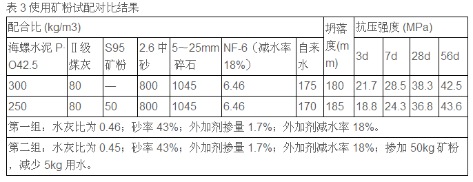 磨細礦粉能延緩膠凝材料的水化速度,延長凝結(jié)時間,尤其在炎熱的夏季及大體積混凝土應(yīng)用中有明顯效果。另外礦粉具有改善混凝土工作性,改善混凝土的內(nèi)部結(jié)構(gòu),提高抗?jié)B和抗腐蝕的能力,這些都有大量試驗證明。因為水泥與礦粉存在部分差價,利用礦粉后期增強效果,既可以降低水化熱,減少裂縫的產(chǎn)生,又可以使混凝土后期強度不變或更高。如表3。