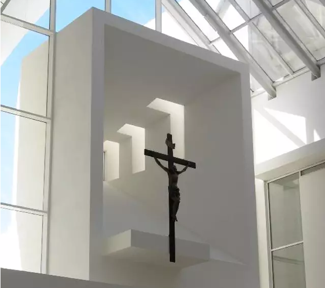 理查德·邁耶作品。教堂高57~90尺不等,如船帆狀的三片白色弧墻,層次井然地朝垂直與水平雙向彎曲,似球狀的白色弧墻曲面。建筑材料包括混凝土、石灰華和玻璃。三座大型的混凝土翹殼高度從56英尺逐步上升到88英尺,看上去像白色的風(fēng)帆。玻璃屋頂和天窗讓自然光線傾瀉而下。夜晚,教堂的燈光營(yíng)造出一份天國的景觀。