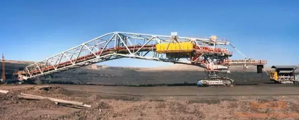 排土能力達到34000噸/小時,臂長超過120米。皮帶排土機為移動式連續(xù)工作的排料設備,它們將來自可移動梯段皮帶運輸機的物料排卸在料堆上,借助皮帶轉載車和皮帶滑行轉載車將物料輸送到排土機。排土機有能力堆高低地、作為行駛路面的平盤,以便隨后用做新采區(qū)的卸料、堆高。除此之外,還可以使用一部皮帶排土機為可移動梯段皮帶運輸機堆起一個高平面。說白了,它就是一個堆土的設備嘍~