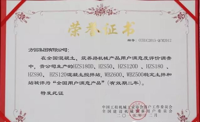 方圓集團(tuán)憑借在售后服務(wù)領(lǐng)域的突出表現(xiàn),榮獲“用戶滿意服務(wù)單位”的稱號(hào),同時(shí),方圓集團(tuán)生產(chǎn)的HZS180D、HZS50、HZS120D、HZS180、HZS90、HZS120型混凝土攪拌站,WBZ600、WBZ500型穩(wěn)定土拌和站被評(píng)為“全國用戶滿意產(chǎn)品”。
