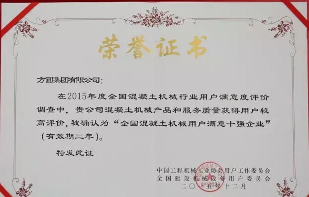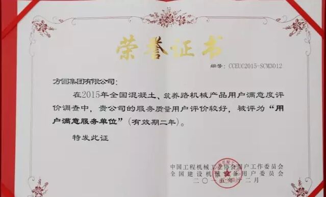 此外,因?yàn)榉綀A集團(tuán)在2015年度全國混凝土機(jī)械行業(yè)用戶滿意度評(píng)價(jià)調(diào)查中,受到廣大用戶的一致好評(píng),被授予“全國混凝土機(jī)械用戶滿意十強(qiáng)企業(yè)”稱號(hào)。在產(chǎn)品質(zhì)量調(diào)查中,連續(xù)七次被評(píng)為“全國用戶滿意單位”。