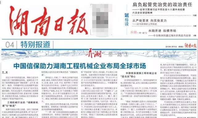 近日,《湖南日報(bào)》專版刊登了宣傳報(bào)道《中國信保助力湖南工程機(jī)械企業(yè)布局全球市場》。報(bào)道肯定了中國信保在履行政策性職能方面取得的成效,并介紹了中國信保長沙營管部在支持湖南省工程機(jī)械行業(yè)企業(yè)更好地“走出去”所采取的措施。報(bào)道詳情如下: