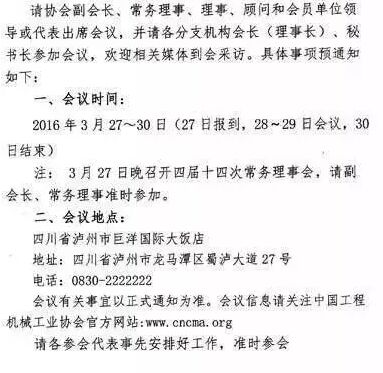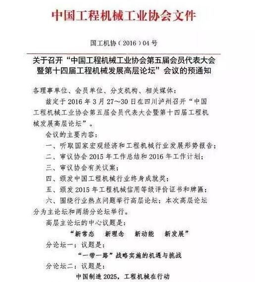 中國工程機械工業(yè)協(xié)會第五屆會員代表大會暨第十四屆工程機械發(fā)展高層論壇茲定于2016年3月27日~30日在四川瀘州召開。