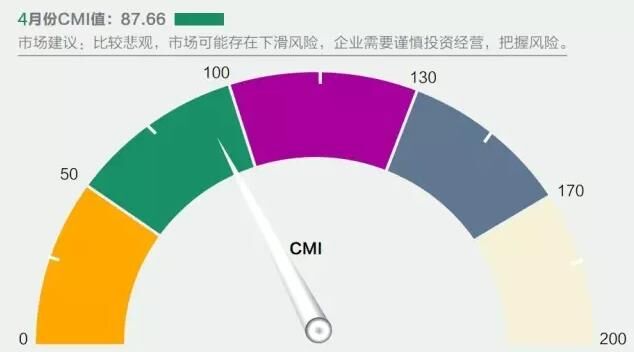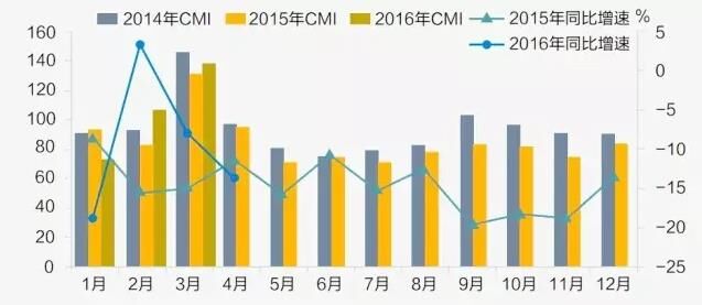 2016年4月份中國(guó)工程機(jī)械市場(chǎng)指數(shù)即CMI為87.66,同比增速-7.27%,環(huán)比增速-35.67%(依據(jù)CMI判斷標(biāo)準(zhǔn),CMI在50~100之間,表示市場(chǎng)比較悲觀,可能存在下滑風(fēng)險(xiǎn))。