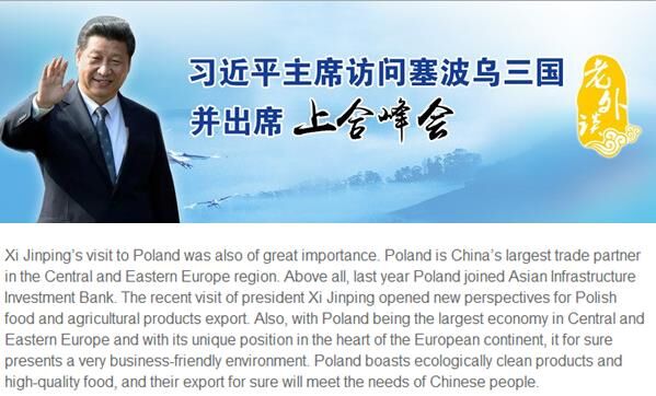 習(xí)近平對(duì)波蘭的訪問同樣意義大重大。波蘭是中國在中東歐地區(qū)的最大貿(mào)易伙伴。去年,波蘭也加入了亞洲基礎(chǔ)設(shè)施投資銀行。習(xí)主席的這次訪問將為波蘭的食品和農(nóng)產(chǎn)品出口開拓新的局面。此外,波蘭是中東歐最大的經(jīng)濟(jì)體而且位于歐洲心臟地帶,它一定能提供非常有利的經(jīng)商環(huán)境。波蘭還提供生態(tài)潔凈的產(chǎn)品和高質(zhì)量的食品,它們的出口肯定會(huì)滿足中國人民的需要。