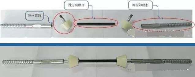 根據(jù)對(duì)日本已完清水混凝土工程考察結(jié)果,日方在施工中均采用三接頭的對(duì)拉螺桿,施工中有效解決了螺桿眼部位的失水漏漿的問(wèn)題,有效避免了熊貓眼的發(fā)生。為了有效保護(hù)清水模板的表面,通過(guò)多輪試驗(yàn)對(duì)比,特別研制出了五段式對(duì)拉螺桿。