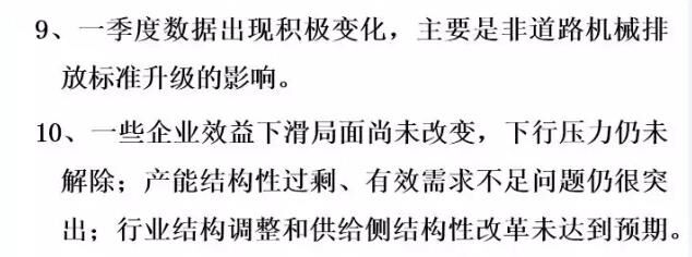 我個(gè)人總結(jié),今年的運(yùn)行情況有這樣十個(gè)方面。第一,從整個(gè)全行業(yè)各企業(yè)的資產(chǎn)規(guī)模上看,目前趨于穩(wěn)定,變化幅度很小,不像前兩年振動(dòng)那么大。第二,從資產(chǎn)負(fù)債率來(lái)說(shuō),現(xiàn)在負(fù)債率是在60%左右,全國(guó)的工業(yè)企業(yè)是56%。所以,這個(gè)行業(yè)的資產(chǎn)負(fù)債率目前看也是很好的。這個(gè)需要引起大家的關(guān)注和分析,我們也希望后幾個(gè)月情況可以穩(wěn)定向好。還有自主品牌市場(chǎng)占有率,在國(guó)內(nèi)市場(chǎng)還是保持高位,從全行業(yè)來(lái)看在90%以上。那么,產(chǎn)業(yè)的集中度又進(jìn)一步地增強(qiáng)了,但有一些企業(yè)挺無(wú)助的,出局了,進(jìn)口額下降。今年按照環(huán)保部5號(hào)令,全行業(yè)工程機(jī)械產(chǎn)品實(shí)現(xiàn)了新的標(biāo)準(zhǔn)升級(jí)。整個(gè)產(chǎn)品進(jìn)行了更新?lián)Q代,這個(gè)非常難能可貴。最后是產(chǎn)能結(jié)構(gòu)性過(guò)剩,有效需求不足問(wèn)題仍然突出,行業(yè)結(jié)構(gòu)調(diào)整還有供給側(cè)結(jié)構(gòu)改革遠(yuǎn)遠(yuǎn)沒(méi)有達(dá)到預(yù)期。即便是按照現(xiàn)在的挖掘機(jī)銷量5500多臺(tái),就算是6000臺(tái),產(chǎn)能又有多少?一旦市場(chǎng)回暖,一些企業(yè)家還是會(huì)頭腦一熱,這樣大一個(gè)產(chǎn)能釋放出來(lái)的產(chǎn)量是什么局面?我們必須保持一個(gè)清醒的頭腦。
