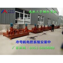 將工字鋼放在冷彎機上,與減速帶動的滾輪接觸后,將壓緊手柄進(jìn)給鎖緊,啟動電機油泵組,由電動油泵輸出的高壓溢流閥(可調(diào)整所有壓力),進(jìn)入集成塊到電纜閥,有電液閥和動點開關(guān)(點進(jìn),點退)控制油缸工作,工作油缸推進(jìn),將工字鋼與三個支撐游輪壓緊并為發(fā)生彎曲變形是時開始計算,油缸推進(jìn)的長度進(jìn)程為10mm-15mm,開主電機帶動工字鋼工作,反復(fù)操作,達(dá)到所需為止。
