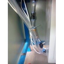 將膩子粉包裝袋套在出料嘴上,撥動彈簧開關(guān),壓袋氣缸開始工作并壓住袋口,控制器將包裝袋重量自動去除,通過空壓機(jī)的氣流經(jīng)三分管分成三路,其中一路去往進(jìn)料口進(jìn)行破拱,保證下料暢通。葉輪高速轉(zhuǎn)動迅速將物料撥出灌入袋中,隨袋中空氣一起溢出的粉塵經(jīng)排氣孔排出(對環(huán)保要求高的用戶也可連接吸塵器,由除塵器吸走)。待加料達(dá)到粗流設(shè)定值(L1)時,氣缸自動將橡膠軟管夾至1/2開口,出料速度減慢,到總設(shè)定(L2)時,氣缸將橡膠軟管完全夾死,出料停止,壓袋氣缸松開袋口,灌裝結(jié)束。