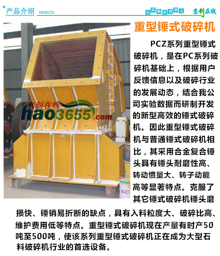 PCZ系列重型錘式破碎機PCZ-1308具有運行成本低,配套功率小,生產(chǎn)成本低,喂料粒度大,破碎比大,產(chǎn)品粒度小等優(yōu)點,是礦山界廣泛使用的破碎設備。