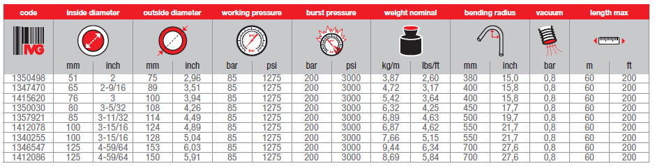 應(yīng)用范圍: 鋼絲層加強(qiáng)膠管,85bar 工作壓力,用于把混凝土輸送到 澆注位置;一般用于混凝土泵車澆筑的末端膠管,管子可以耐清 洗時(shí)的負(fù)壓,通常提供全流通設(shè)計(jì)的鍛造硬化接頭